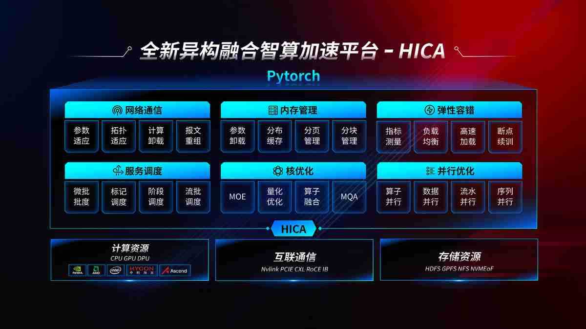 通过自研的服务层、、、中间适配层、、以及调度编排算法,,,采用数据并行、、、、模型并行等多种并行方式,,把并行计算任务进行有效的分解,,使其分别由相应的软件栈和算力资源来承接。。。当GPU资源变化,,HICA可以实时动态调度计算子任务并调整模型拓扑和架构,,,以充分聚合各种算力资源。。。。