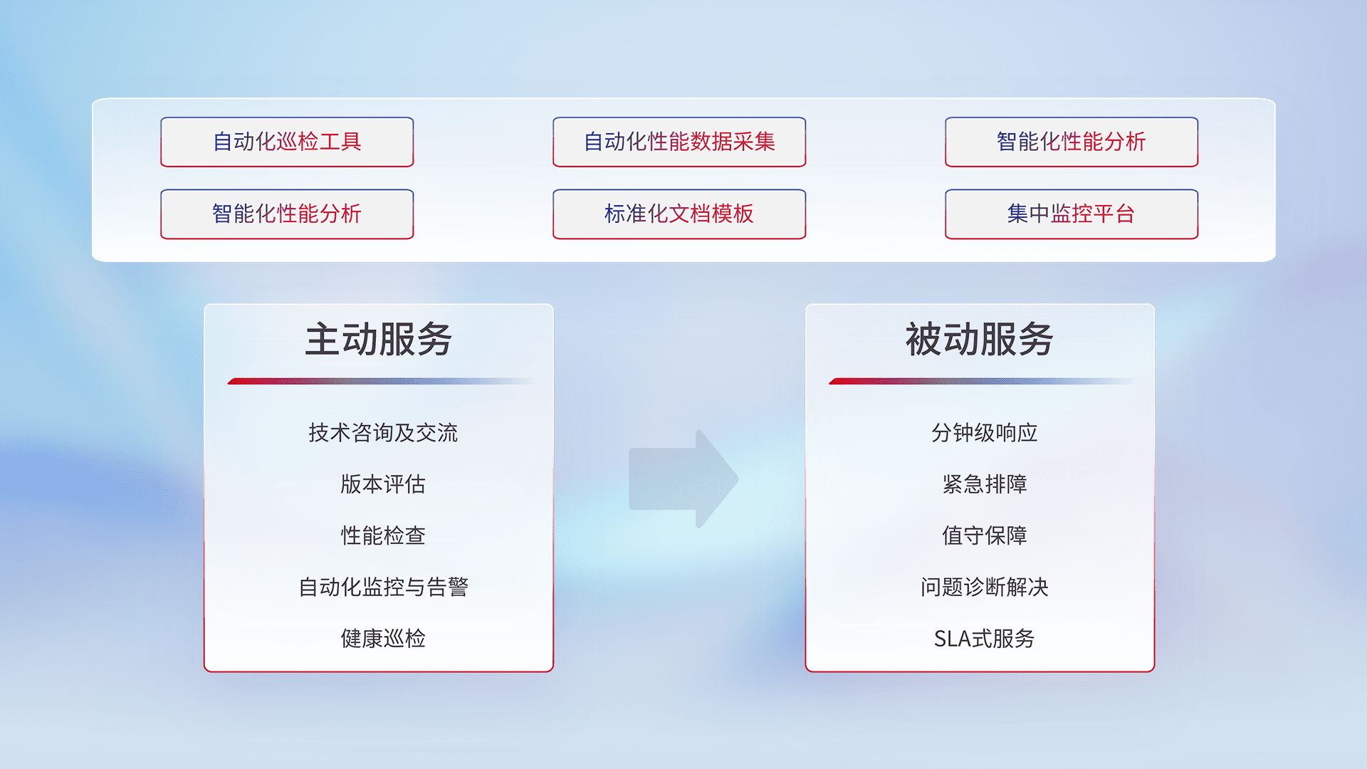 智能化工具和标准化文档,,,,保障服务质量,,,,提供主动服务(包含技术咨询、、版本评估、、性能检查、、、自动化监控与告警、、健康巡检)和被动服务包含(分钟级响应、、紧急排障、、、、值守保障、、问题诊断解决、、SLA服务)。。